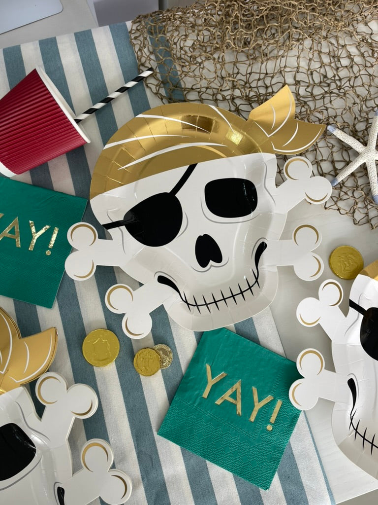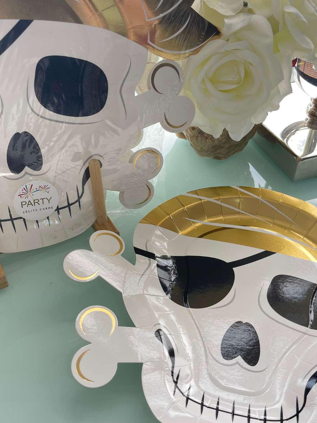 Estos platos en forma de calavera pirata con detalles en lámina dorada son el toque audaz y brillante que tu fiesta necesita. Perfecto para una mesa wow sin complicarte la vida. Su color blanco y dorado son ideales para combinar con cualquier paleta de colores que elijas para tu fiesta de piratas. Combínalo con nuestros vasos y servilletas temáticas y conquista todos los "¡wow!" de tus invitados. 🏴☠️✨