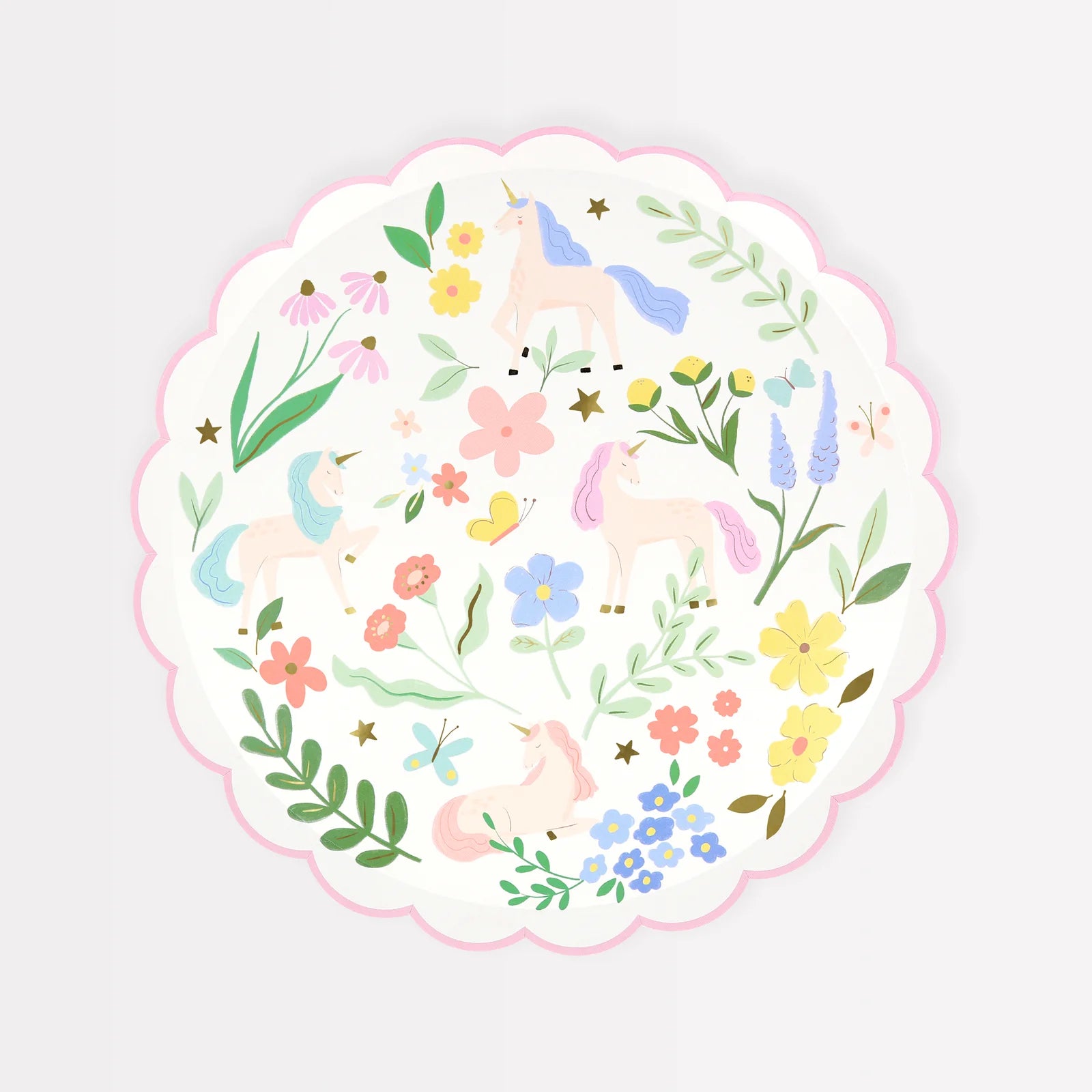 La combinación de unicornios y flores de pradera es una combinación hecha en el paraíso de la fiesta. Estos platos, con un elegante borde festoneado, harán que tu fiesta de unicornio o princesa parezca tan mágica al instante. Ideal para mezclar y combinar con vajillas y decoraciones en tonos pastel.